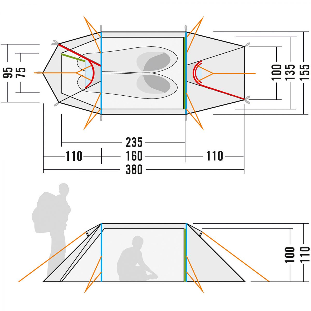 - Zwei Eingänge in das Innenzelt, einer davon mit separat verschließbarem Moskitofenster