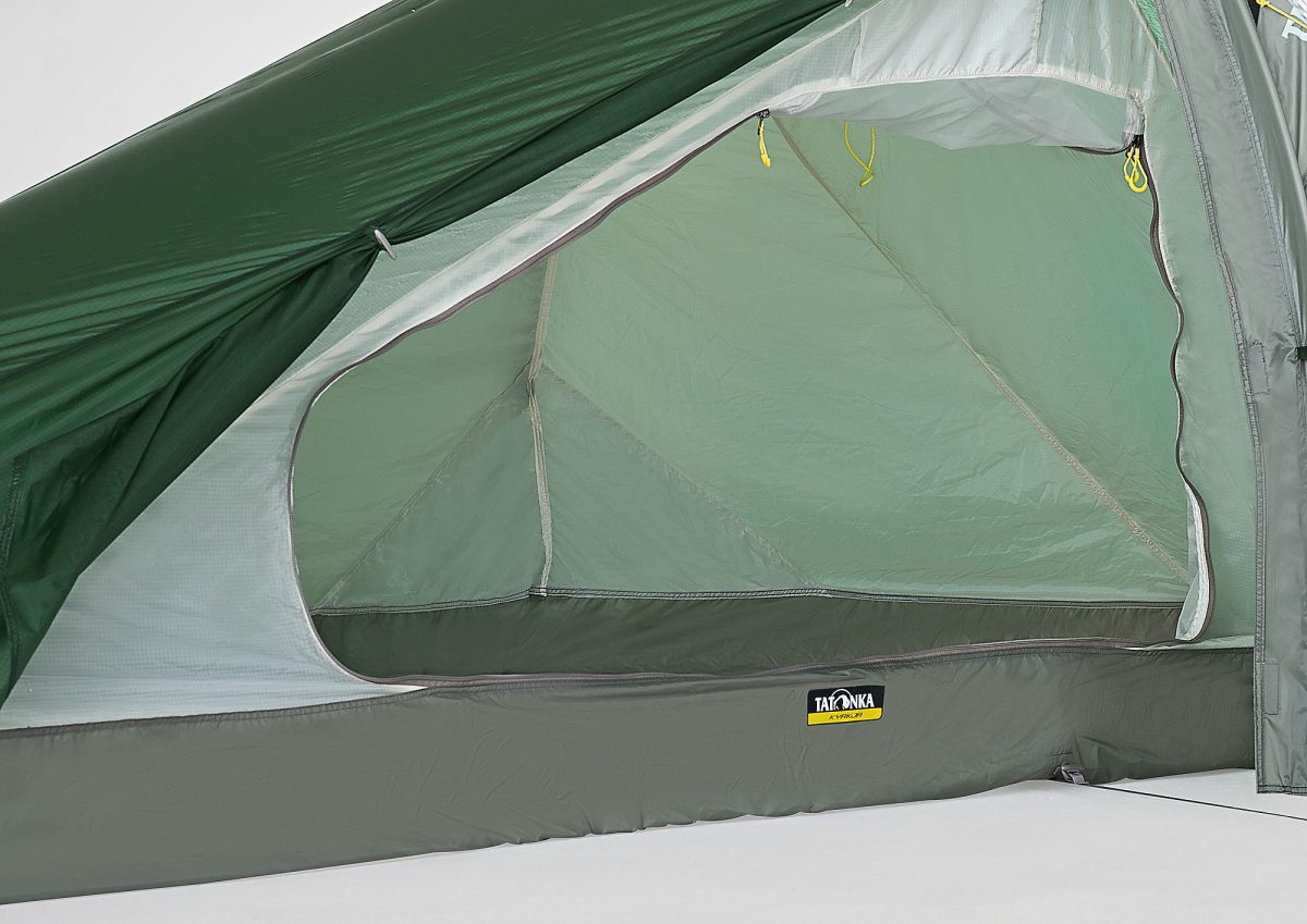 Das Außenzelt des Kyrkja besteht aus äußerst reißfestem, 5-fach silikonbeschichtetem Nylon 6.6 Ripstop-Gewebe. Der wasserdichte Zeltboden aus PU-beschichtetem Nylon mit einer Wassersäule von 10.000 mm schützt optimal vor Nässe von unten.