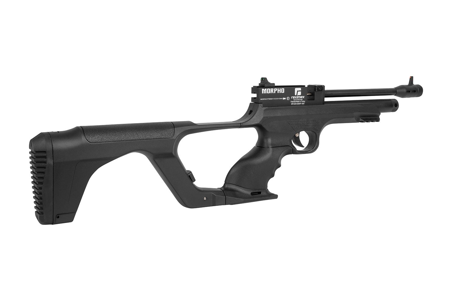 Die Reximex Morpho ist eine CO₂-betriebene Luftpistole im Kaliber 5,5 mm mit modularem Aufbau. Sie kann sowohl als klassische Pistole als auch mit optionaler Schulterstütze verwendet werden und bietet dadurch vielseitige Einsatzmöglichkeiten.