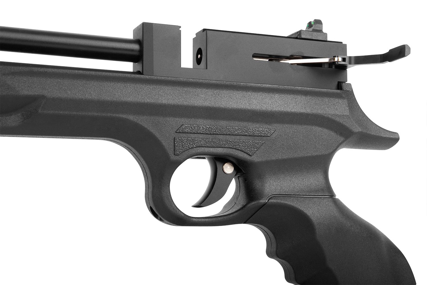 Das seitliche Spannsystem ermöglicht ein komfortables Nachladen. Die Pistole kann wahlweise mit Magazin oder als Einzellader genutzt werden. Eine Fiberoptik-Visierung unterstützt die Zielerfassung, während eine integrierte Schiene die Montage von Zubehör erlaubt.