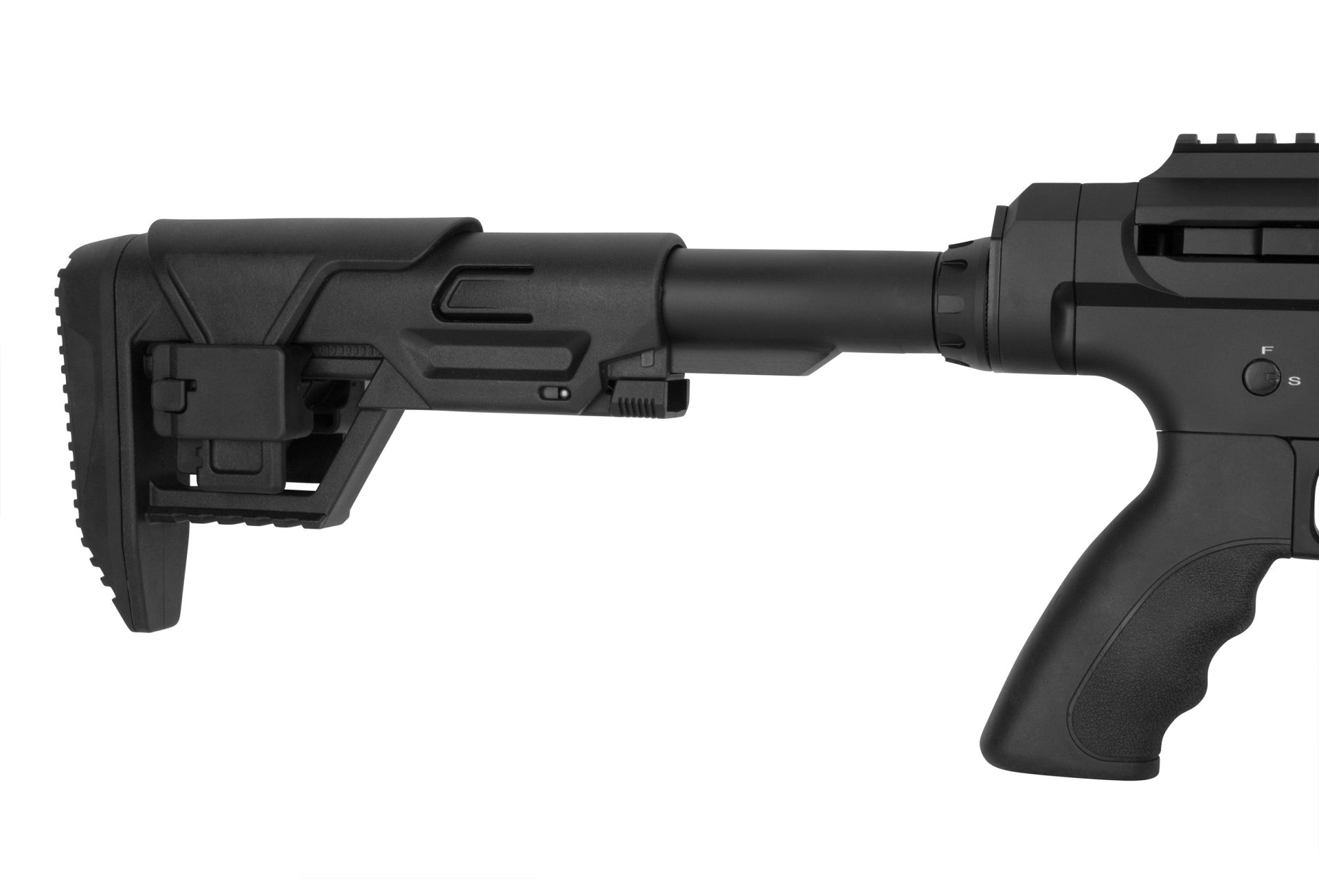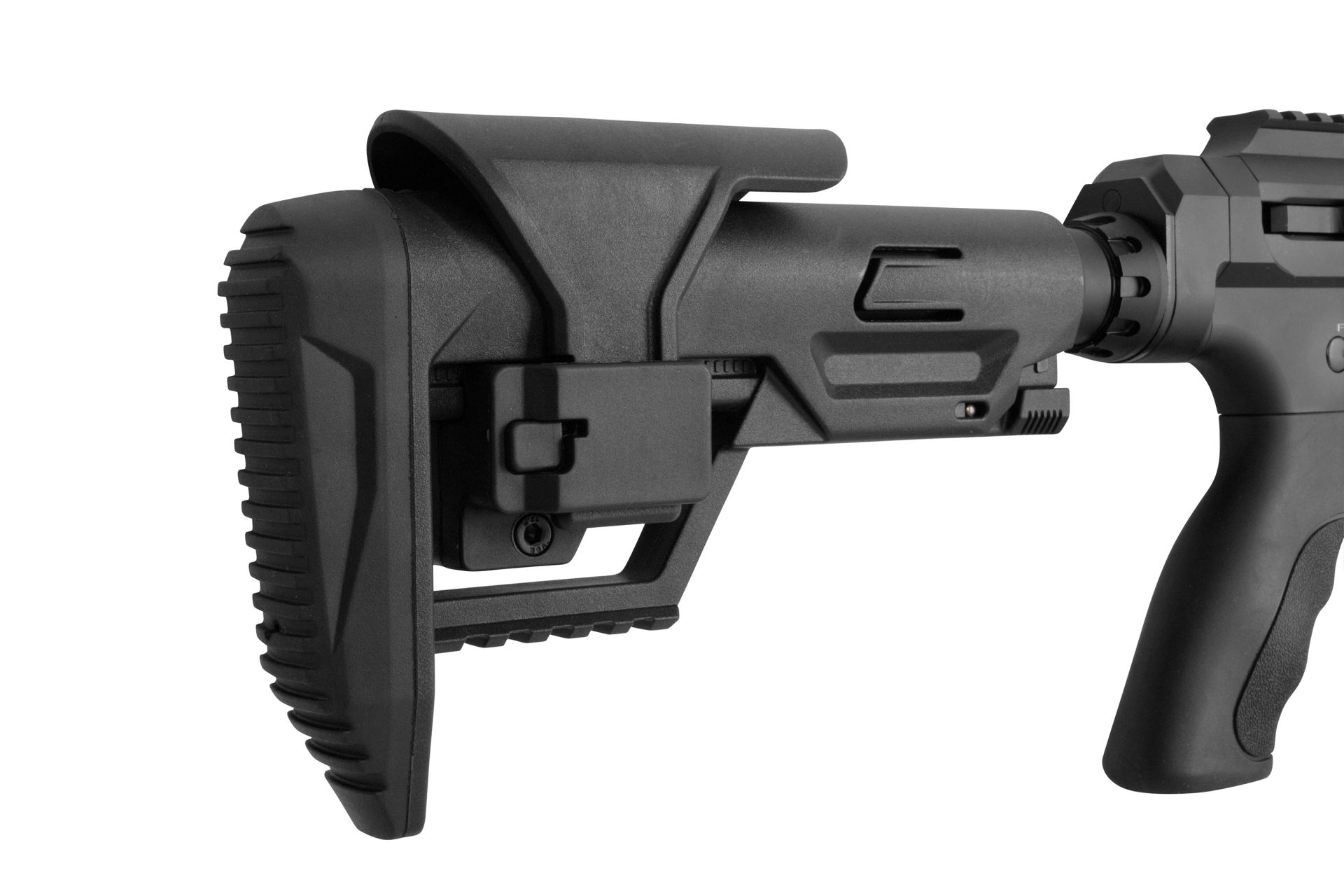 Das Reximex Force-1 Luftgewehr ist eine exzellente Wahl für alle, die auf der Suche nach einem qualitativ hochwertigen und zuverlässigen Pressluftgewehr sind. Mit einer beeindruckenden Präzision und einer Leistung von ca. 5,6 Joule ist dieses Gewehr ideal für Freizeit- und Sportschützen geeignet. Es verfügt über eine fortschrittliche Dämpfungstechnologie für einen reduzierten Rückstoß. Pressluft-Technologie Taktischer Schiebeschaft mit höhenverstellbarer Wangenauflage 22mm Montageschiene Zusätzliche Picatinny-Schiene an der Unterseite Integriertes Manometer 22mm Montageschiene Inkl. 2 Magazine Kaliber: 4,5 mm (.177) Schaftmaterial: Synthetik System: Pressluft | PCP Munitionstyp: Pellets Lauf: gezogener Lauf Magazinkapazität: 14 Schuss Abzug: Single-Action Farbe: Schwarz Material: Metall + Kunststoff Anschluss: Foster Sicherung: Manuell Abzugsgewicht: Einstellbar Montageschiene: 11mm + 22mm Picatinny Visierung: Keine Visierung Laufgewinde: 1/2'' UNF Max. Fülldruck: Max. 200 BAR Kartuschenvolumen: 310 ml Gewicht: 3.300 g Gesamtlänge: 950 - 1.030 mm Energie: ca. 5,6 Joule