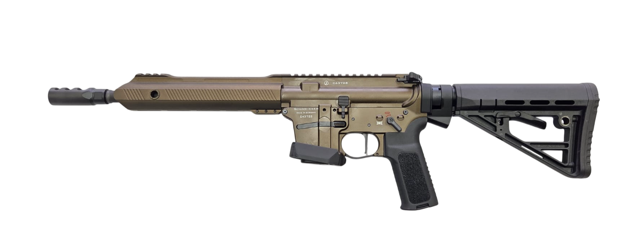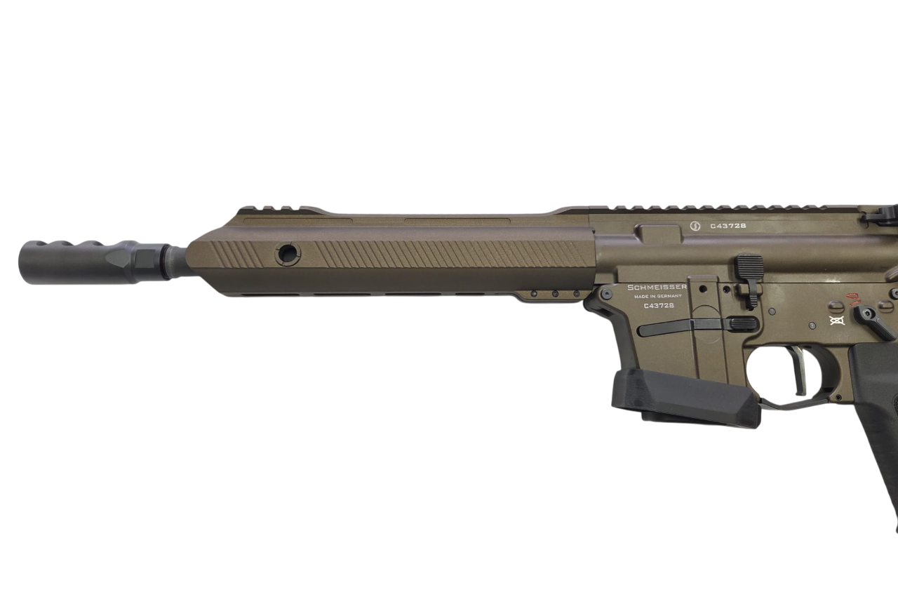 Kategorie: Langwaffen - SelbstladebüchsenKaliber: 9mm LugerZustand: neuBeschreibungAufgrund vielfacher Nachfragen nach einem verlässlichen AR15 9mm System, freuen wir uns Ihnen nun, nach langer Entwicklungszeit unsere Schmeisser AR15-9 Produktreihe präsentieren zu dürfen. Die neue Schmeisser AR15-9 ist komplett beidseitig bedienbar, des Weiteren wurden die Zuführung, sowie der Masseverschluss optimiert. Egal für welche Anforderungen, statisch oder dynamisch, mit der Schmeisser AR15-9 haben Sie die ideale Waffe in der Hand.Jetzt NEU auch in der sportlichen Konfiguration (BKA Bescheid) mit Schubschaft und NoRec Kompensator.Art: SelbstladebüchseKaliber 9×19Lauflänge: 267 mm / Drall: 1:10Gesamtlänge: 693 mm eingeschoben, 769 mm ausgezogenGewicht: 3.040 gSicherung: beidseitige 45° Sicherung.Farbe: Schwarz/Burnt Bronze/ OD Green LieferumfangWaffenkoffer inkl. ZahlenschlossReinigungsset inkl. BürsteBedienungsanleitung10 Schuss Magazin ACHTUNG: Zum Kauf dieses Produkts ist die Vorlage der Erwerbsberechtigung erforderlich !!!