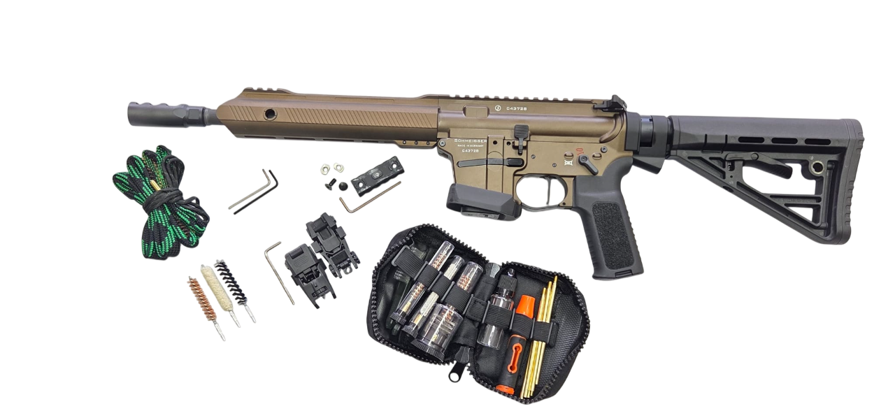 Die neue Schmeisser AR15-9 ist komplett beidseitig bedienbar, des Weiteren wurden die Zuführung sowie der Masseverschluss optimiert. Egal für welche Anforderungen, statisch oder dynamisch, mit der Schmeisser AR15-9 haben Sie das ideale Werkzeug in der Hand. Gewicht: 3640 g Länge: 79,5 cm eingeschoben, 89v5cm ausgezogen Lauf: 14,5“ / 42,5cm, Heavy Barrel brüniert Patronenlager: .223 Rem./ 5.56 NATO" Drall: 1/9 Knopfgezogen Mündungs-feuerdämpfer: NoFlash, Stahl, A2/M4 nach Mil-Spec Gewinde: M14x1 Verschluss: Semi-Auto Verschlussträger, phosphatiert und teilverchromt Oberes Gehäuse: Nach Mil-Spec aus 7075 T6 Aluminium geschmiedet inkl. Picatinny-Profil, harteloxiert Durchladehebel: Beidseitig bedienbar, 6082 T6 Aluminium Handschutz: Freischwingend mit Stahlgewindeeinsätzen (HELICOIL®). 23,2 cm Länge, “Slim-Line” Profil, Picatinny-Schiene oben, dreiseitige M-lokHaltepunkte, harteloxiert Visierung: Verstellbares Flip-Up Kunststoffvisier Korn: Verstellbares Flip-Up Kunststoffvisier Unteres Gehäuse: nach Mil-Spec aus 7075 T6 Aluminium geschmiedet, harteloxiert Schaft: 7 Positionen Hinterschaft Buffer: Standard carbine buffer und Feder Abzug: Druckpunktabzug, Abzugsgewicht 2.400 Gramm (1.500/900 Gramm) Sicherung: Beidseitige Flügelsicherung Griff: Kunststoff Pistolengriff gummiert Magazinkapazität: 10 Schuss Schaftröhre: Solid Tube mit Überwurf, 7075 T6 Aluminium Verschlussfanghebel: Beidseitig bedienbar, Stahl Lieferumfang: 1x Schmeisser AR15-9 S4F 1x Reinigungskordel 1x Schmeisser Waffenkoffer inkl. Zahlenschloss 1x Bedienungsanleitung 1x Reinigungsbürsten ACHTUNG: Zum Kauf dieses Produkts ist die Vorlage der Erwerbsberechtigung erforderlich !!!