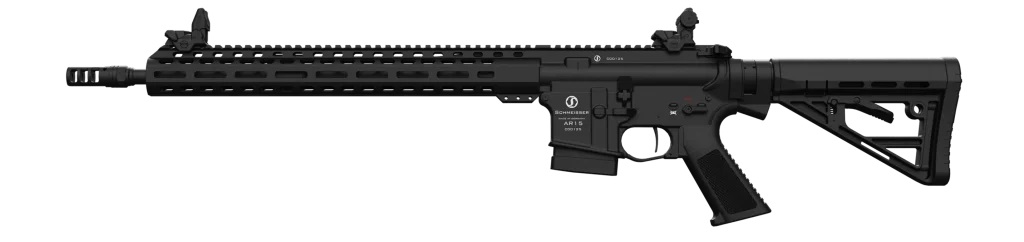 Die skelettierte und stark gewichtsreduzierte Schmeisser AR15 Dynamic L grey 16,75″ mit ihrer perfekten Voll-Ausstattung ist unsere leichteste Waffe für Sport und Jagd..Sie ist zusätzlich korrosionsresistent in lightning grey beschichtet und hat einen langen Vorderschaft.
