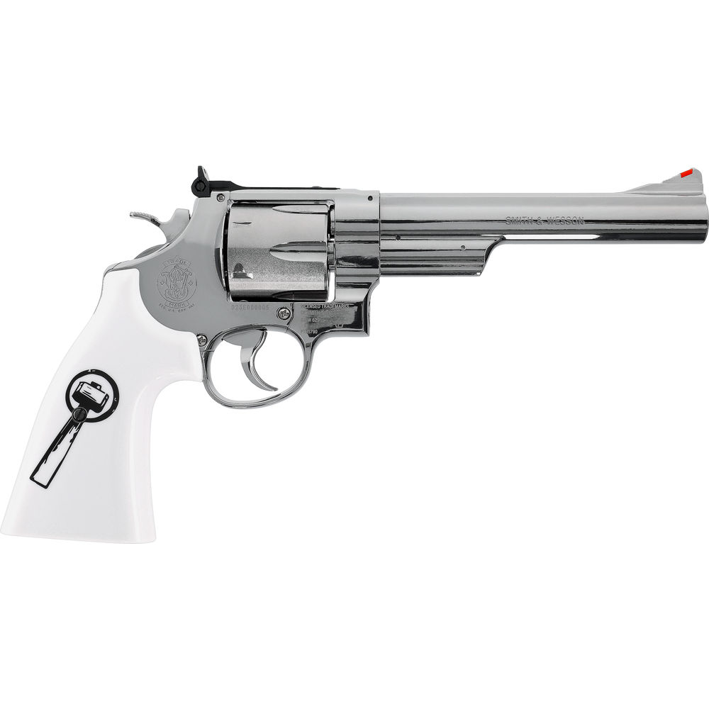 In der Sonderausführung “Trust Me“ glänzt der legendäre Smith & Wesson 629 Revolver mit einer edlen Vernickelung und Griffschalen in Elfenbein-Optik. Geprägt vom actionversprechenden Logo, lässt diese Airgun die Herzen von Serienfans der 80er-Jahre höherschlagen.