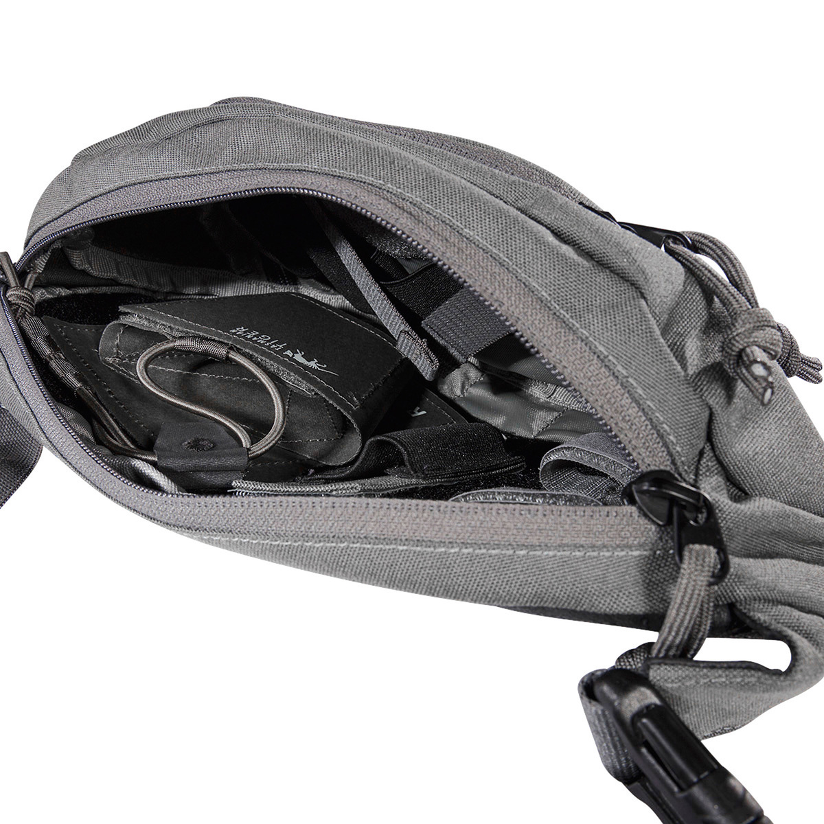 - Große Gürteltasche mit zwei Unterteilungen zum verdeckten Tragen einer Kurzwaffe.