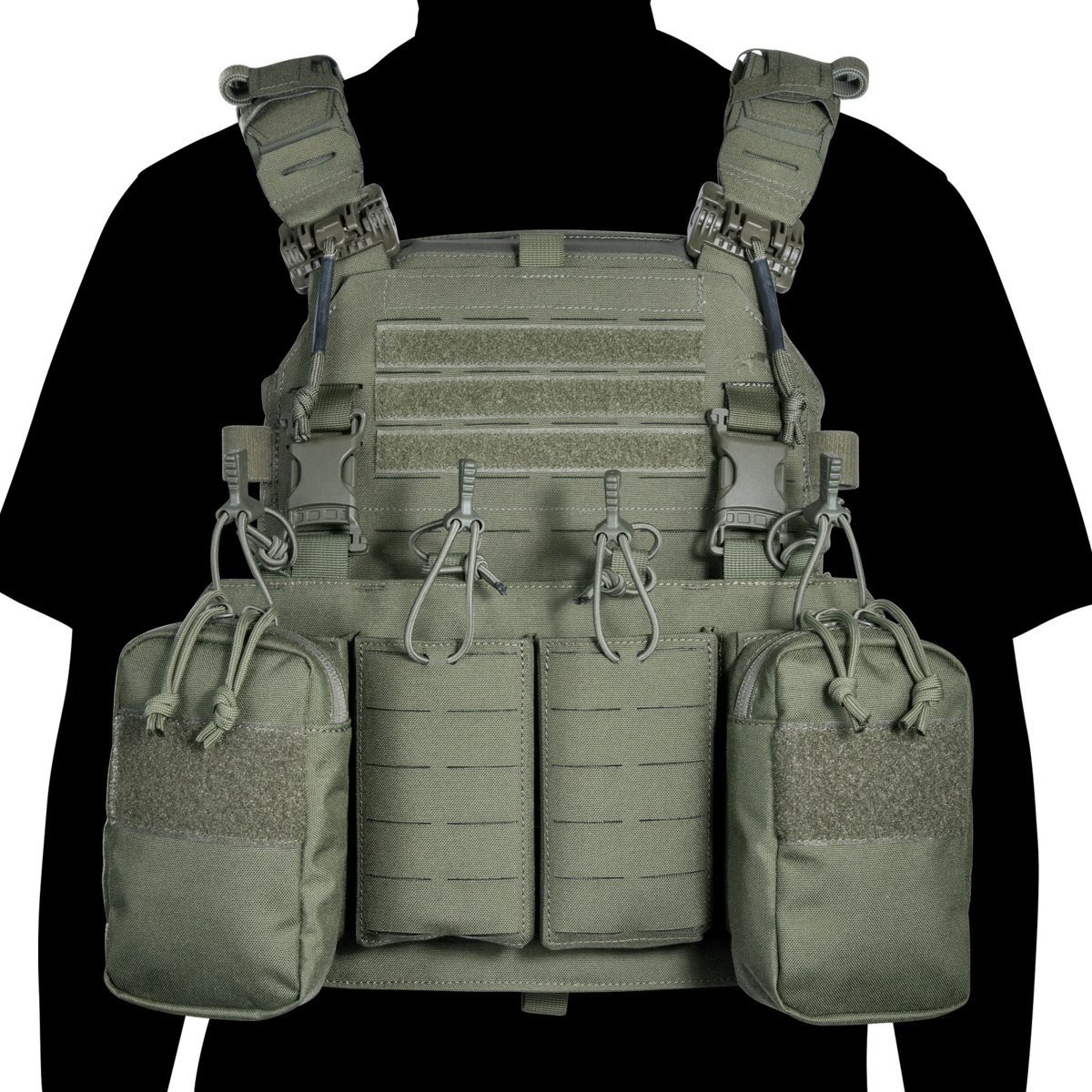 Flaches Gurtzeug mit vier fest vernähten Magazintaschen, abnehmbaren Seitentaschen und abklettbarem Frontflap für SAPI-Platten der Größe M.
