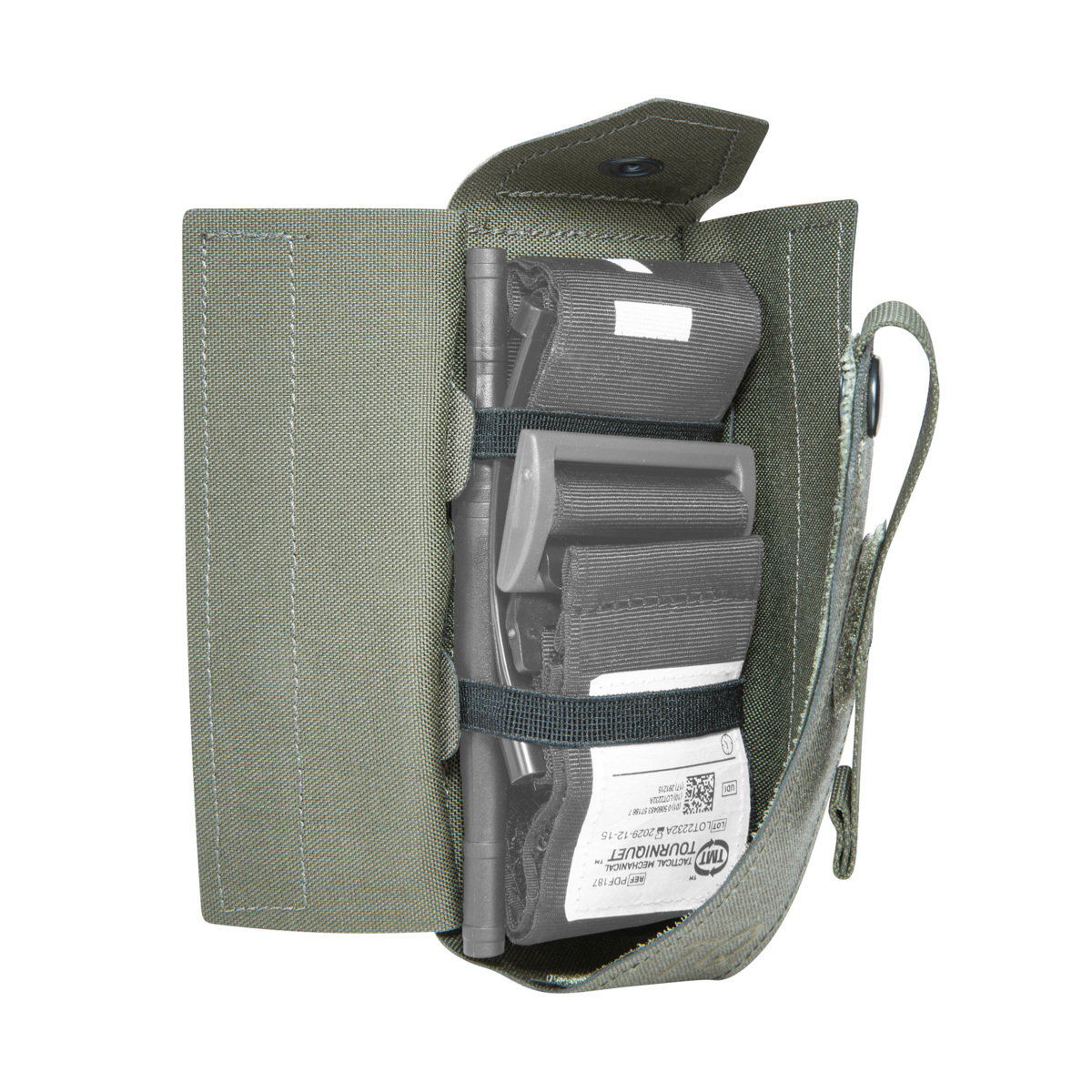 Rundum geschlossene Klettverschluss-Tasche für das breite Tactical Mechanical Tourniquet (TMT™) von Combat Medical®. Mit IRR-Ausrüstung.