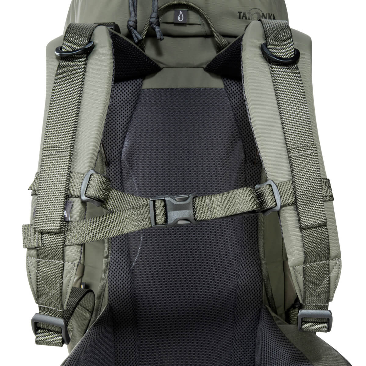 Hike Pack 30 BC Bushcraft-Rucksack Robuster Wander- und Bushcraft-Rucksack: Tatonka Hike Pack 30 BCDen Hike Pack 30 BC haben wir speziell für Bushcraft-Fans entwickelt. Der Rucksack mit 30 Liter Volumen ist aus besonders robustem Cordura gefertigt, und er besitzt ein modulares Befestigungssystem für die Ergänzung mit zusätzlichen Taschen oder anderer Ausrüstung.Belüftetes Rückensystem – ideal bei intensiver BewegungDas leichte Netzrückensystem des Hike Pack 30 BC bietet sehr angenehme Trageeigenschaften und spielt insbesondere bei intensiver Bewegung und anstrengenden Touren seine Vorteile voll aus, denn dann sorgt es für ein schnelles Abdampfen der Schwitzfeuchtigkeit. Dabei passt es sich jeder Bewegung flexibel an.Molle-kompatibles Befestigungssystem für individuelle EirweiterunenAuf der Front und an den Seiten des Rucksacks sowie auf einer Hüftflosse kannst du zusätzliche Taschen oder andere Ausrüstung anbringen. Du kannst zum Beispiel unsere Universal Pouches (Artikel-Nr. 3032, 3033, 3034, 3035), aber auch Taschen anderer Hersteller mit Molle-System nutzen. (MOLLE steht für Modular Lightweight Load Carrying Equipment.) Der Hike Pack 30 BC ist mit eine PFC/PFAS-freien Imprägnierung versehen. Frame Vent-TragesystemWanderstockhalterungLastkontrollriemenGepolsterte SchultergurteHöhenverstellbarer BrustgurtHüftgurt mit Reißverschlusstasche auf einer HüftflosseUmlaufende BodenkompressionSeitenkompressionHandgriffDeckel mit MaterialschlaufenDeckelfachReißverschlussfach unter dem DeckelElastische Zickzack-Schnürung auf dem DeckelSchlüsselhalterRegenhülleTrinksystemvorbereitungSeitentaschen aus elastischem MaterialReißverschluss-FronttascheMaterialschlaufen auf der FrontFlauschklett-Fläche (10 x 5 cm) auf der Front zum Anbringen von PatchesPFC/PFAS-freie ImprägnierungModulares Befestigungssystem auf der FrontMolle-System auf den Seiten und auf einer Hüftflosse