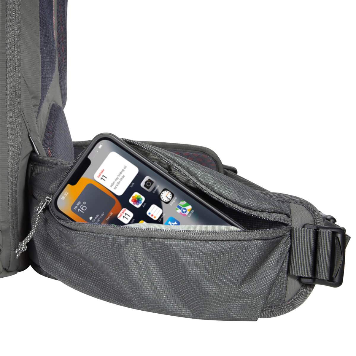 • Abnehmbarer, gepolsterter Hüftgurt mit Materialschlaufe rechts und Reißverschlusstasche links