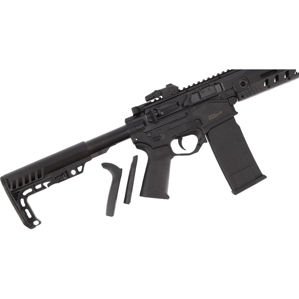 Zur Anpassung an die eigenen Bedürfnisse wartet die UX Strike Force mit zahlreichen Individualisierungsmöglichkeiten auf: Dank austauschbarer Griffrücken am Pistolengriff (Größen S/M/L enthalten) und dem 5-stufigen Schubschaft findet jeder Schütze den idealen Grip. Über den Vorderschaft mit M-LOK und Quick Detach-Schnittstellen (QD) und einer Picatinny-Toprail lassen sich Optiken und weiteres Zubehör montieren, eine klappbare Fiberoptik-Lochvisierung mit Höhen- und Seiteneinstellung ist bereits im Lieferumfang enthalten. Der Lauf weist ein Schalldämpfer-Gewinde (M14x1 links) mit montierter Mündungsbremse auf.
