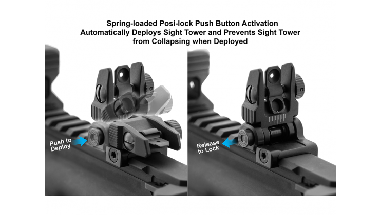 - Die federbelastete Posi-Lock-Druckknopfaktivierung fährt den Visierturm automatisch aus und verhindert, dass der Visierturm beim Ausfahren zusammenbricht