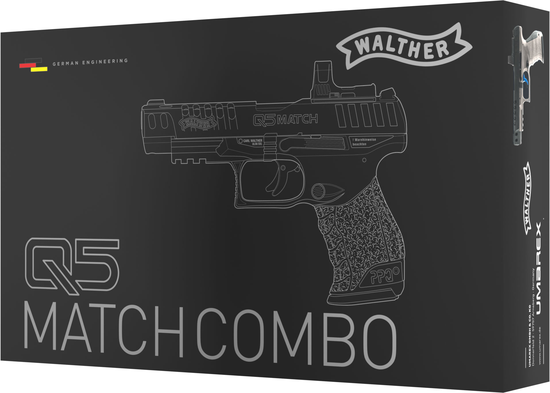 Die Walther Q5 Match ist eine exzellente Wettkampfpistole mit sportlichen Ambitionen. Aufgrund der Lauflänge, langen Visierlinie, Leuchtpunktvisier-Aufnahme und der optimalen Abzugscharakteristik eignet sie sich für dynamische Disziplinen ebenso wie als Verteidigungswaffe. Die CO₂-betriebene Airgun im Kaliber 4,5 mm Diabolo ist das perfekte Ebenbild für Freizeitschützen mit gehobenen Ansprüchen an Präzision und Realismus in Optik und Handling. Dafür sorgen das clevere System mit 21-schüssigem Kettenmagazin, ein gezogener Lauf und der deutlich spürbare Rückstoß bei jedem Schuss. Vervollständigt wird das Combo-Set durch das mitgelieferte Leuchtpunktvisier Umarex RDS 8 und eine Cover-Plate zur Montage bei Verwendung von Kimme und Korn. Q5 Match-typische Merkmale, wie die Abzugzüngelsicherung, der umsetzbare Magazinhalter und die verstellbare Kimme finden sich auch an der CO₂-betriebenen Airgun. Als zusätzliche Schwenksicherung dient der rechte Schlittenfanghebel. Inkl. Leuchtpunktvisier Umarex RDS 8, Montagewerkzeug und Cover-Plate Holsternutzung aus dem Umarex-Zubehör nur bei Verwendung von Kimme und Korn möglich Kettenmagazin für 21 Diabolos Combo-Set mit Umarex RDS 8 Leuchtpunktvisier Metallschlitten mit integrierter Leuchtpunkt-Aufnahme Blowback Gezogener Lauf Seitenverstellbare Kimme Abzugzüngelsicherung Rechter Schlittenfanghebel als zusätzliche Schwenksicherung Umsetzbarer Magazinhalter Inkl. Cover-Plate zur Montage bei Verwendung von Kimme und Korn Holsternutzung aus dem Umarex-Zubehör nur bei Verwendung von Kimme und Korn möglich Energiestufe (E₀): < 3,0 J Geschossgeschwindigkeit (V₀): 110 m/s (361 fps) Kaliber: 4,5 mm (.177) Diabolo Antrieb: 1x 12 g CO₂ Magazinkapazität: 21 Schuss Schusskapazität: 105 Schuss AbzugDouble Action Sicherung: Abzugzüngelsicherung, Schwenksicherung Länge: 210 mm Gewicht: 920 g Holster-Typ: A