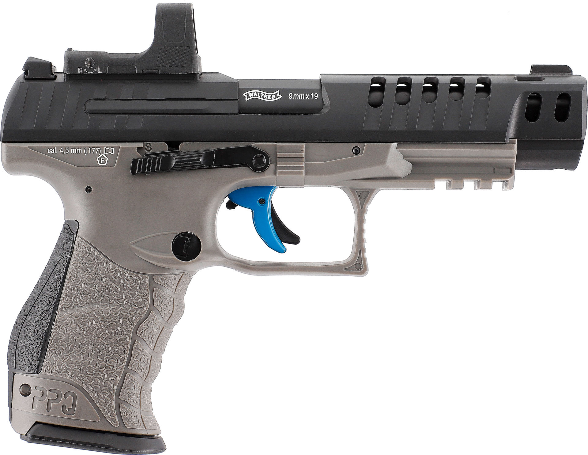 „It‘s You Duty To Be Ready” – Mit diesem Claim legt die Walther Performance Duty Pistol ihren Anspruch an Qualität und Einsatzbereitschaft für professionelle Anwender offen dar. Im Set mit dem RDS 8 Point Sight offenbart die PDP ihr volles Potential. Der Schlitten der CO₂-betriebenen Airgun ist originalgetreu Optics Ready (OR) und nimmt über separat erhältliche Adapterplatten nicht nur das beiliegende RDS 8, sondern auch alle Leuchtpunktvisiere mit dem Vortex, Leupold, C-More und Trijicon Footprint auf. Eine offene Visierung mit seitenverstellbarer Kimme steht alternativ zur Verfügung. Ihr hochwertiger Metallschlitten, die exakten Abmessungen und die effiziente NBB-Bauweise versprechen ein ausdauerndes Schießerlebnis. Eine Picatinny-Schiene am Dustcover erlaubt die Montage von Zubehör, die Abzugzüngelsicherung verhindert, dass sich ungewollt ein Schuss löst und das Anstichtool für die 12 g CO₂-Kapsel ist im Griffrücken integriert. Eine zusätzliche Schiebesicherung erhöht die Bediensicherheit. Energiestufe (E₀): < 3,0 J Geschossgeschwindigkeit (V₀): 110 m/s (361 fps) Kaliber: 4,5 mm (.177) BB Antrieb: 1x 12 g CO₂ Magazinkapazität: 16 Schuss Schusskapazität: 160 Schuss Abzug: Double Action Only Sicherung: Abzugzüngelsicherung, Schiebesicherung Länge: 182 mm Gewicht: 625 g Holster-Typ: A