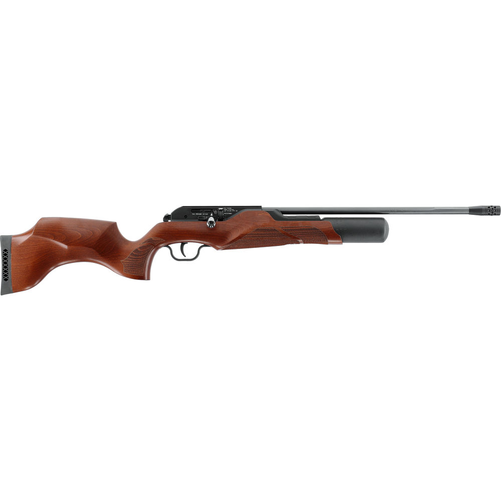 Innen arbeiten zuverlässig ein präzise gefertigtes Pressluft-System – Made in Germany. Über den großzügigen Repetierhebel werden die Diabolos aus dem 8-schüssigen Aluminium-Trommelmagazin in den Lauf aus der Fertigung von Lothar Walther geführt. 500 mm lang und mit einer Mündungsbremse samt 1/2“ UNF-Gewinde versehen, gewährleistet er eine stabile Flugbahn und lässt Schalldämpfer zu. Die Energie liefert der fest verbaute Pressluft-Tank mit 230 bar-Technik und integriertem Füllventil und Manometer. Für persönliche Bestleistungen ist der Vorzugsweg des Abzugs einstellbar.